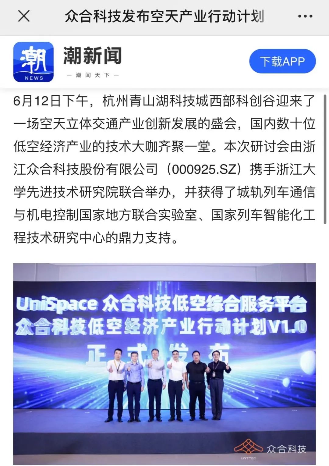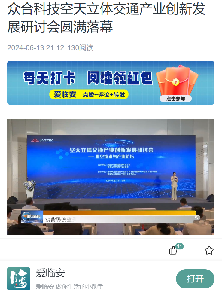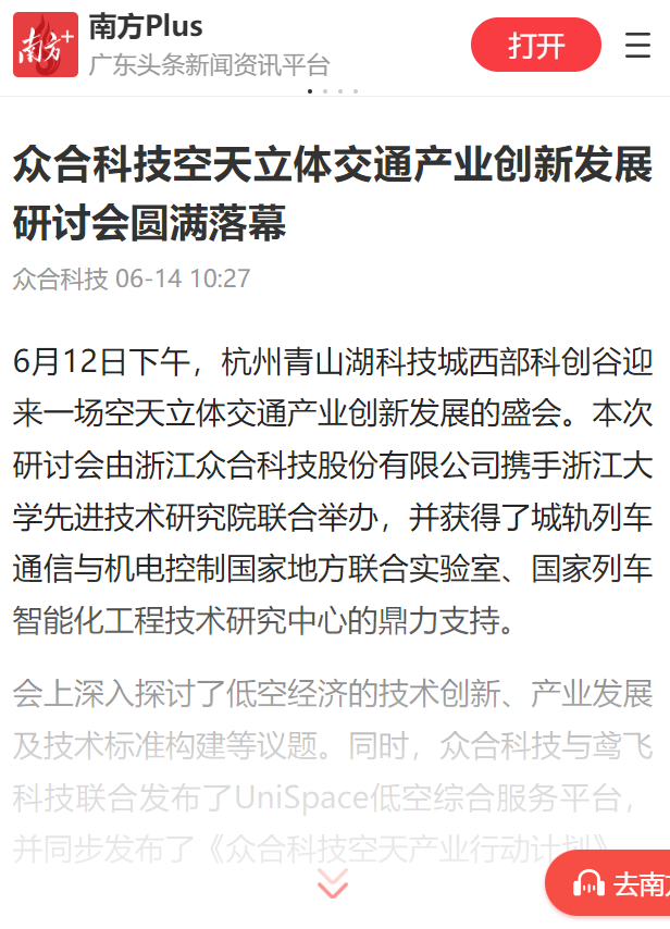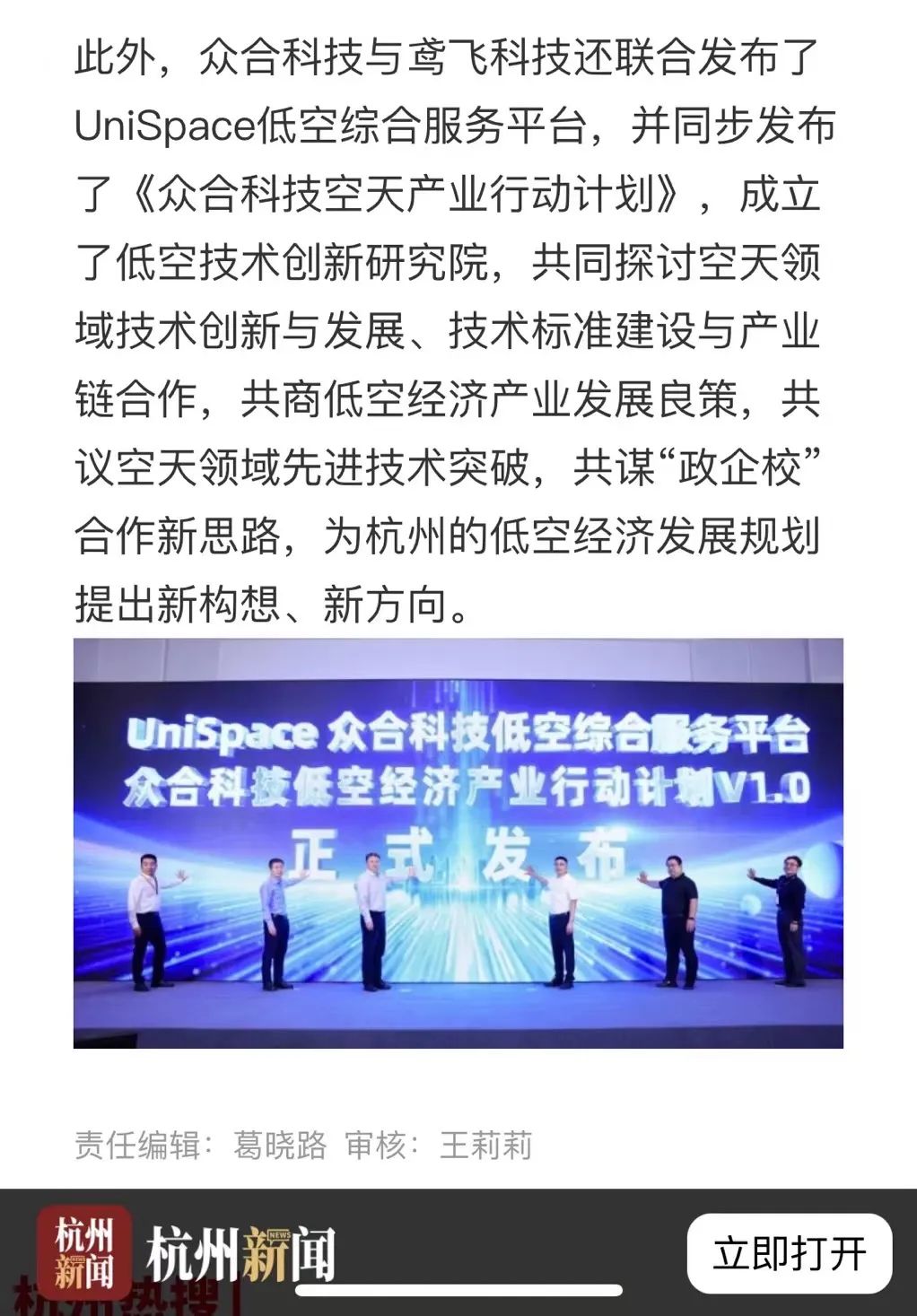 研討會(huì)由浙江眾合科技股份有限公司攜手浙江大學(xué)先進(jìn)技術(shù)研究院聯(lián)合舉辦。會(huì)上,眾合科技與鳶飛科技聯(lián)合發(fā)布了UniSpace低空綜合服務(wù)平臺(tái),并同步發(fā)布了《眾合科技空天產(chǎn)業(yè)行動(dòng)計(jì)劃》,展現(xiàn)了眾合科技致力于構(gòu)建“車(chē)路云協(xié)同+低空+低軌衛(wèi)星”的立體交通產(chǎn)業(yè),實(shí)現(xiàn)空地一體、天地互聯(lián)、立體空間的協(xié)同發(fā)展的堅(jiān)定決心。