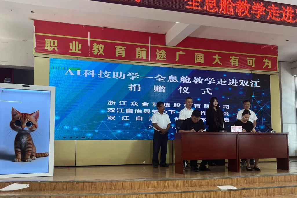 7月初,當臨滄市委書記杜建輝率團考察眾合科技時,雙江自治縣便與眾合科技達成了戰略合作,雙方約定在科技助學、科技助農、自然資源保護開發及茶產業數字化等領域展開深度合作。基于這一合作共識,今日,云南省臨滄市雙江自治縣職業教育中心報告廳內,“AI科技助學——全息艙教學走進雙江”捐贈儀式溫暖啟幕。這不僅是眾合科技ESG行動計劃的又一次重要實踐,更為雙江自治縣的教育與農業發展注入了新的科技動能。